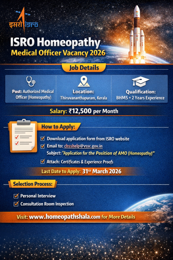 The prestigious Indian Space Research Organisation (ISRO) has announced an exciting opportunity for homoeopathic professionals. Applications are invited for the post of Authorized Medical Officer (Homeopathy) at its healthcare facility in Thiruvananthapuram.