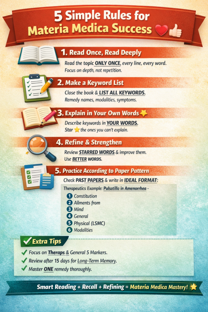 Golden takeaway: Materia Medica success isn’t about cramming—it’s about smart reading, active recall, refining, and practicing in exam format. Follow these 5 rules, and you’ll see a transformation in your understanding and confidence.