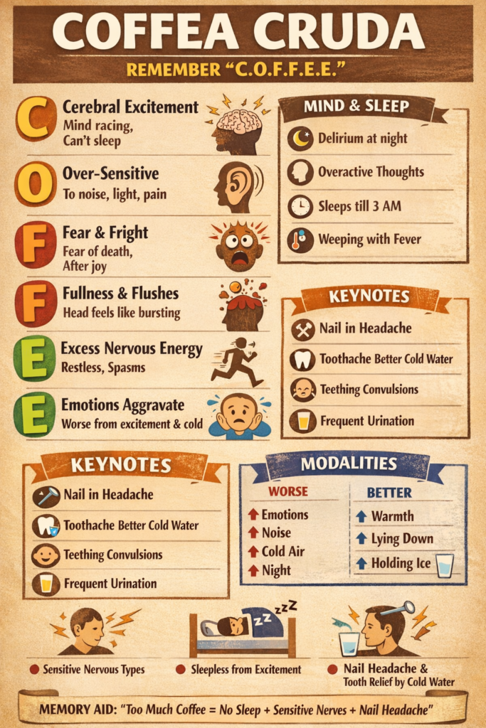 Coffea Cruda in Homoeopathy – Keynotes, Mnemonics & Exam Revision Guide